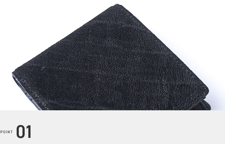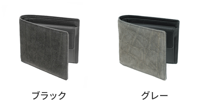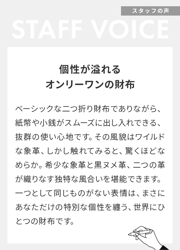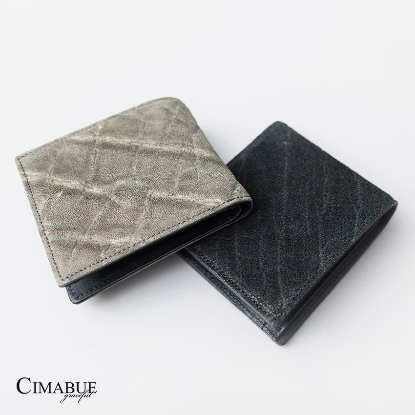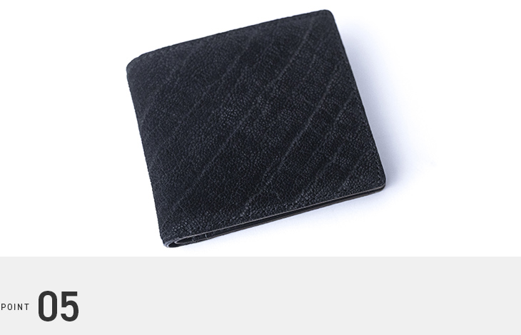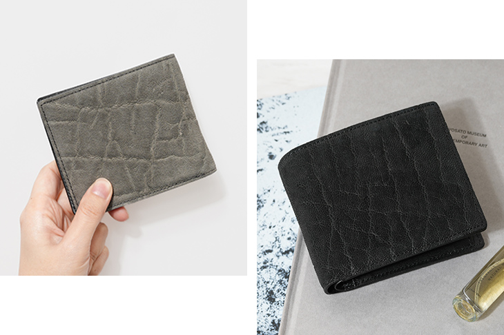 ワシントン条約により取引が制限されているため、大変希少価値が高い、陸の王者とも称されるアフリカゾウの革を使用した、小銭入れ付きの二つ折り財布です。革の表面全体が独特で繊細な粒立ちに覆われており、大胆な印象とは裏腹に、上品な表情を醸し出しています。表面は微細に起毛しているのも特徴で、ヌバック調のしっとりとした滑らかな感触です。