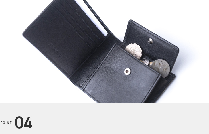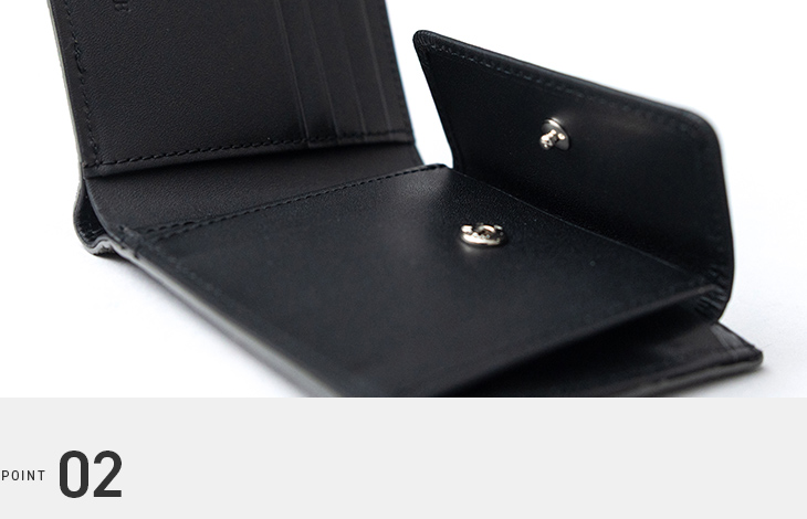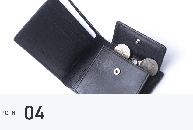 フラップに芯材があるため、小銭入れの開閉は驚くほどスムーズ。美しいフォルムを崩さないスマートなデザインも魅力です。カードポケット4箇所とフリーポケット2箇所、計6枚のカードを収納できます。