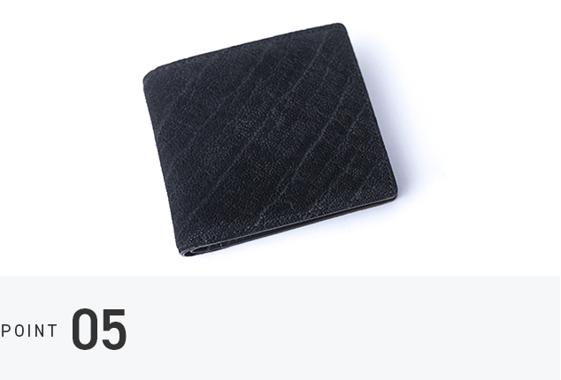 表面が厚く強固で摩擦に強く、傷がつきにくいです。また、水に強く雨の日でも水濡れをあまり気にせずご使用いただけます。現場仕事の方や、ポケットに財布をしまう方、スーツをお召しの方にもおすすめです。
