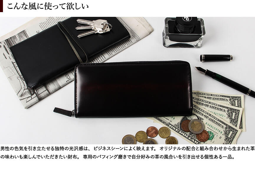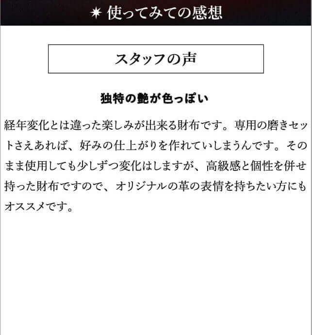 彼へのクリスマスプレゼントに購入させて頂きました。 シンプルだけど主張し過ぎないカラーリングがされているデザインに彼も気付いてくれました。 使い込みで風合いが変わっていくのが革の楽しみだと思いますので、これから共にしていく時間の楽しみでもあります。 以前もこちらで商品を購入しましたが納品まで対応が素早く感激しています!また期間がありましたらフリースピリッツさんにお願いしたいと思います!