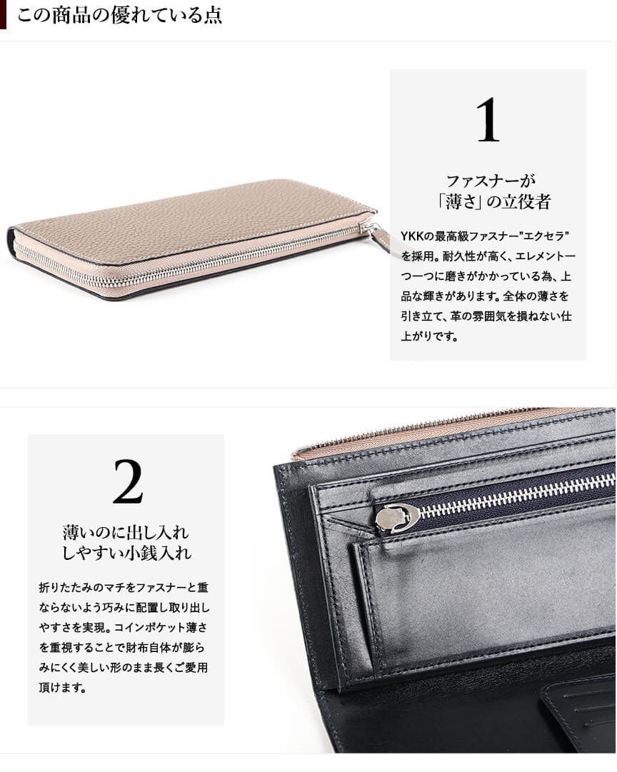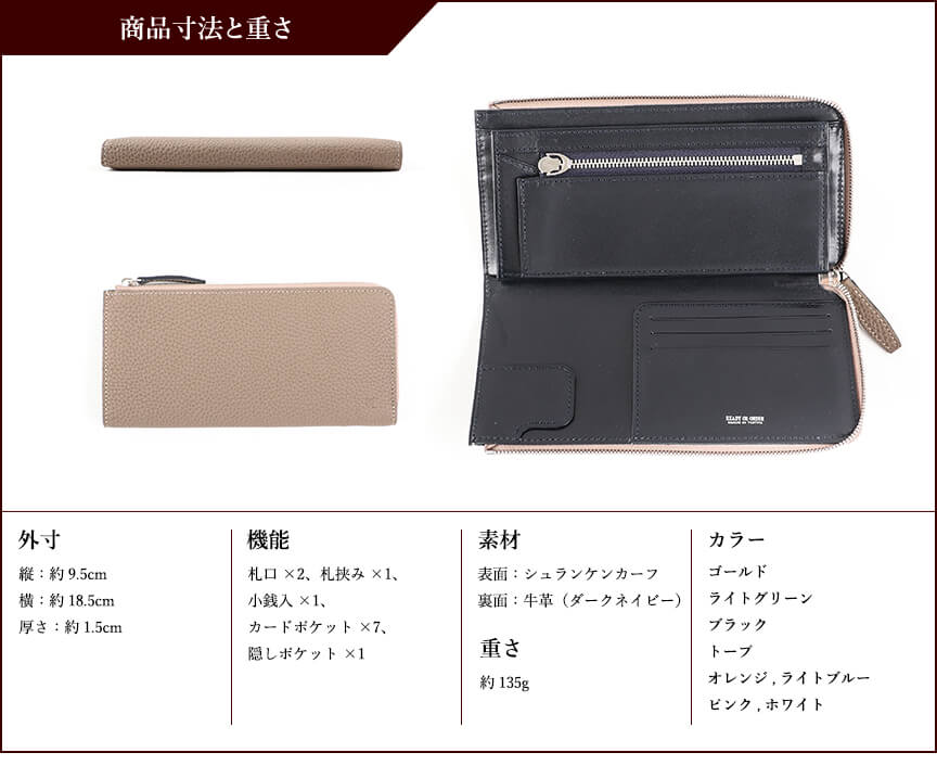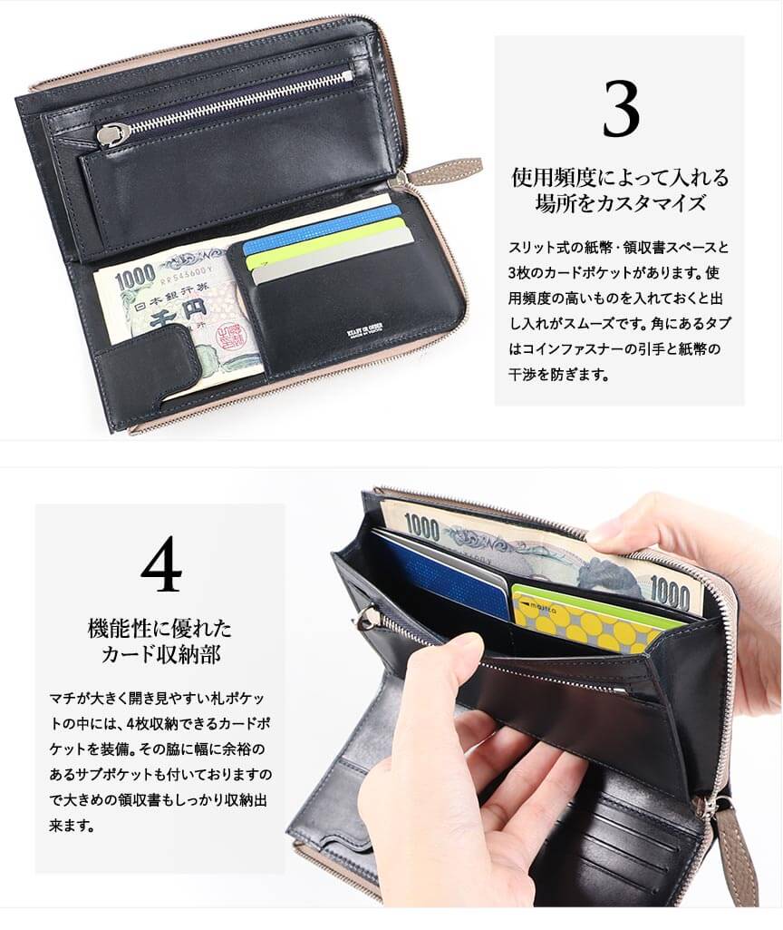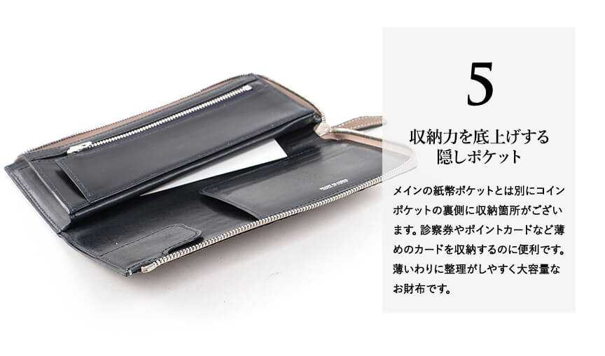 札口×2、札挟み×1、小銭入×1、カードポケット×7、隠しポケット×1