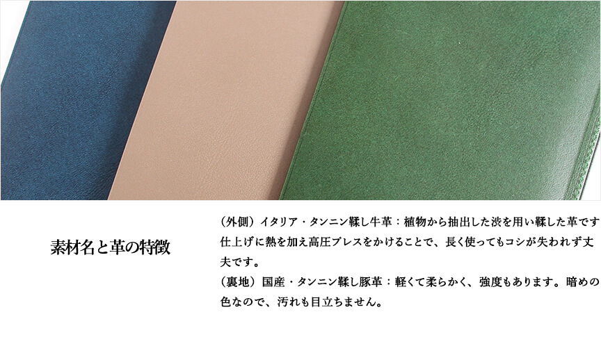 イタリア産タンニンなめし牛革(OUT/IN)、国産タンニンなめし豚革(裏地)