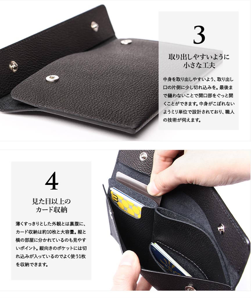 動画を見て購入しました。 皮の質含めてとても良いと思います。新しいせいかちょっとお金の出し入れがしずらいですが馴染めば変わるのかと思います。 かなり厚みが薄いです。逆に少し厚くしてもう少しカード等が入るようにしてもいいのではとも思いました。