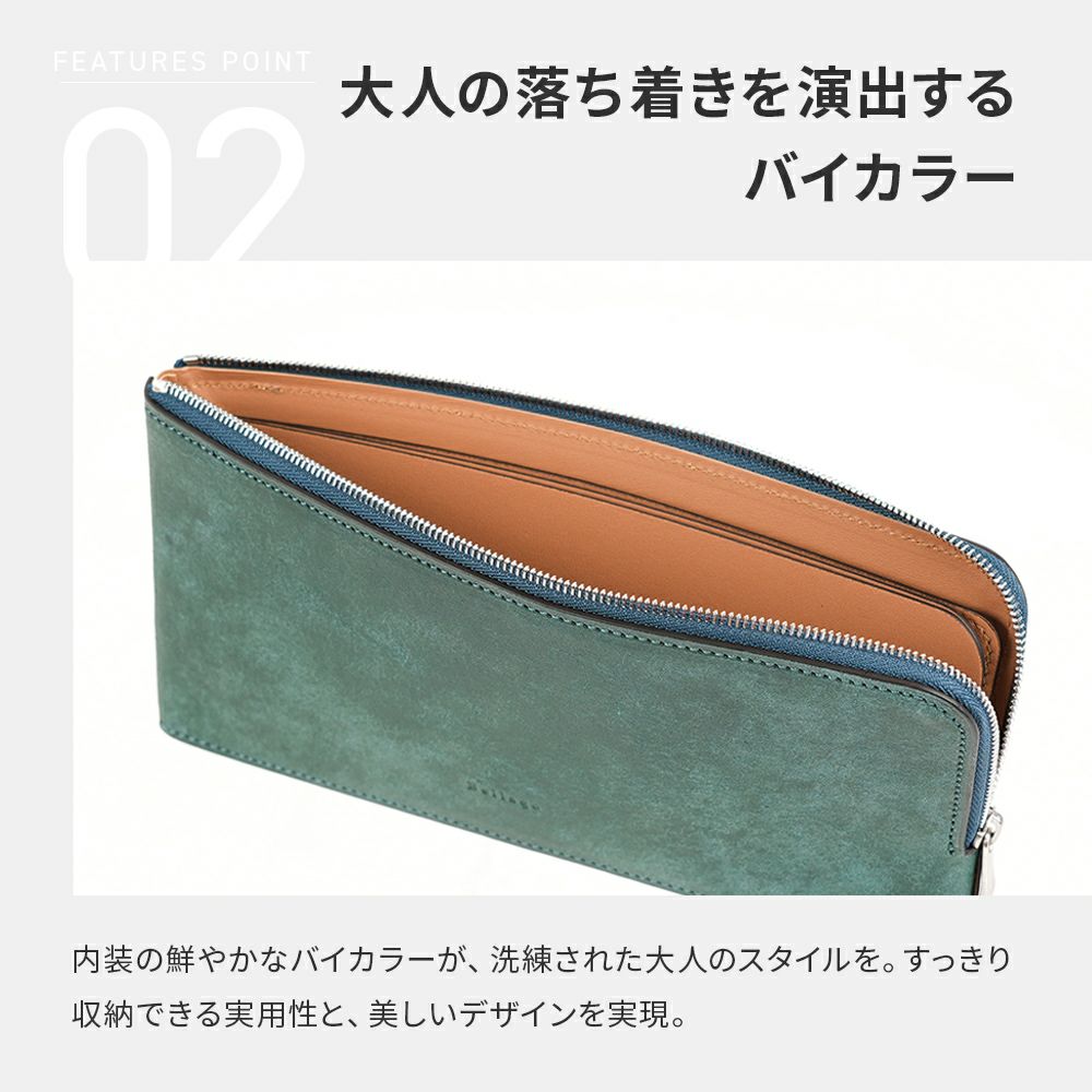 内装の鮮やかなバイカラーが、洗練された大人のスタイルを格上げ。カードや紙幣をすっきりと収納できる実用性と、美しいデザインを実現しました。毎日の生活に寄り添い、長く愛用できる上品な逸品です。