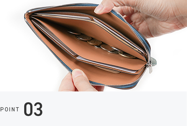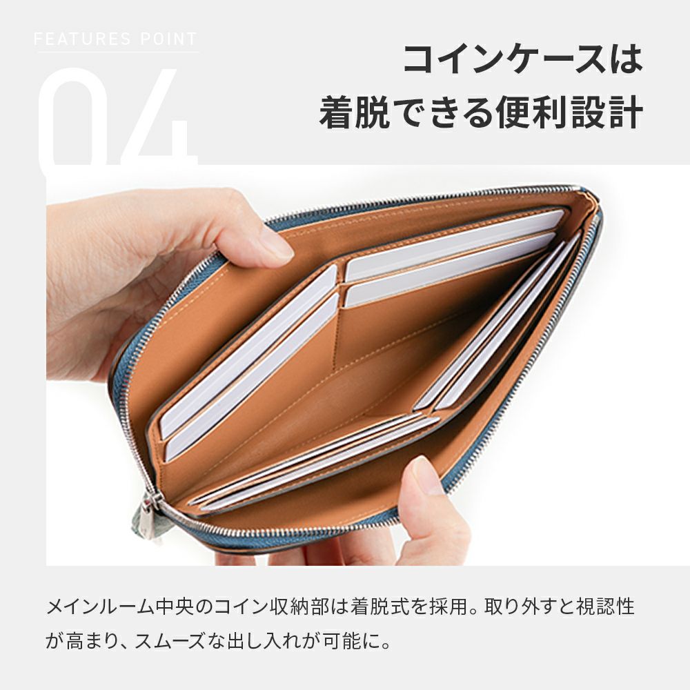 メインルーム中央のコイン収納部は着脱式を採用。普段は別のコインケースを使っている方や、背面ポケットを小銭入れ代わりにしたい方にも便利。取り外すと視認性が高まり、スムーズな出し入れが可能になります。