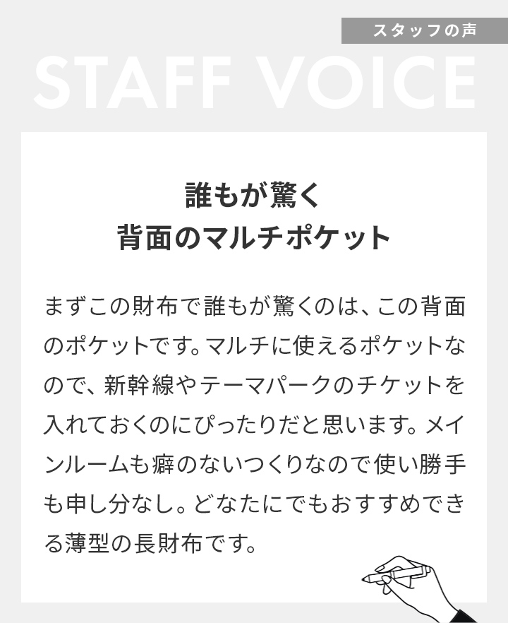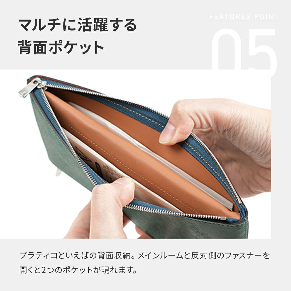 神戸の直営店でオーダーモデルとして展開されていたプラティコの長財布モデルが、ユーザーの声に応えてついに製品化。使いやすさに定評のある仕分け構造が、長財布仕様でさらにパワーアップしました。背面の2つのポケットには、チケットや交通系カードなどを入れておくのに便利です。