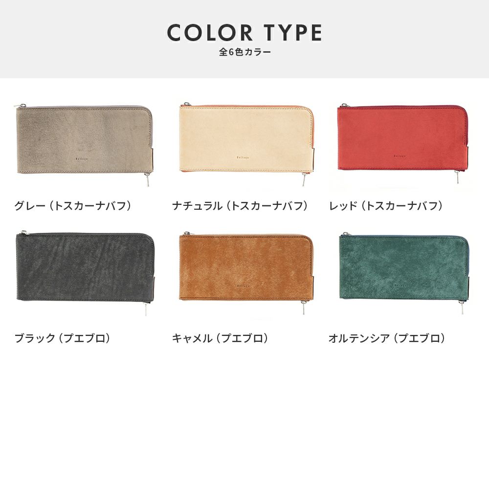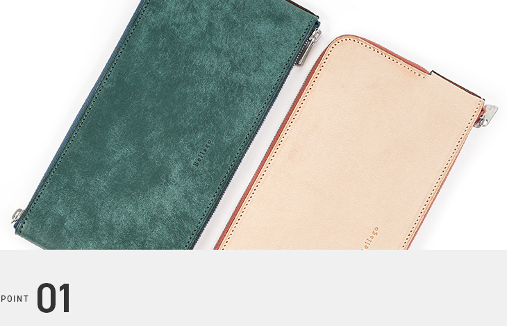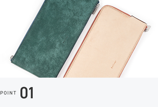 本体には、上質なイタリアンレザー「プエブロ」と「トスカーナバフレザー」の2種類をご用意。どちらも使い込むほどにマットな質感から艶やかな深い色へと変化していく、経年変化の魅力をご堪能いただけます。