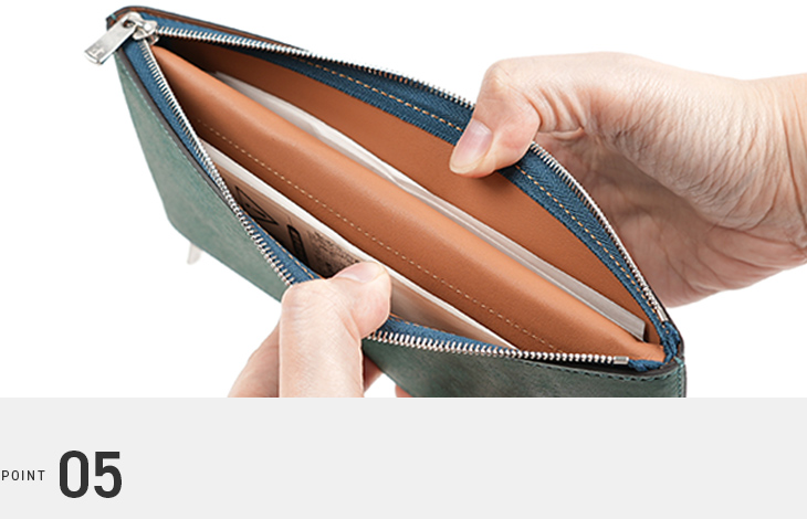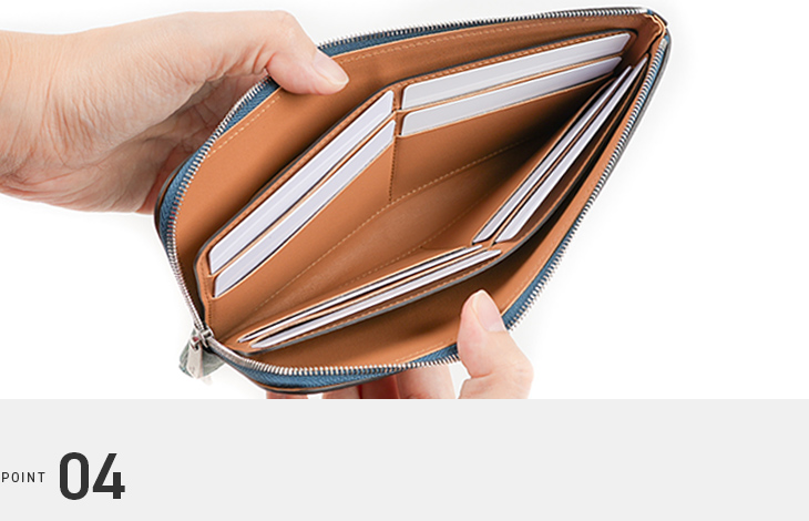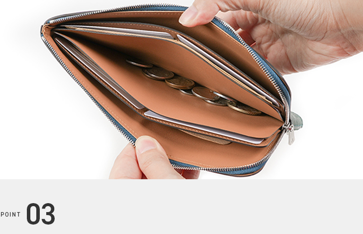 厚さ1.5cmという驚異の薄さの中に詰まった収納力。メインポケットの反対側に2部屋備わっているので、家計とプライベートのレシートを分けるのもよいでしょうし、カード入れとして使うのもよい長財布です。