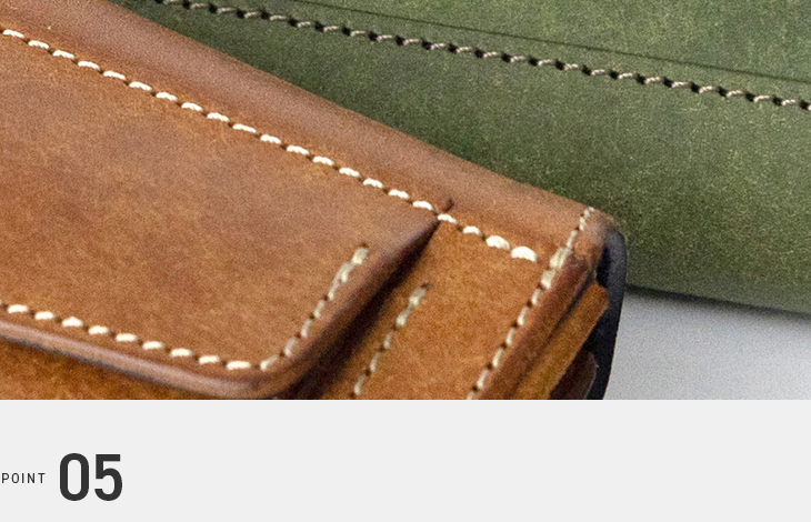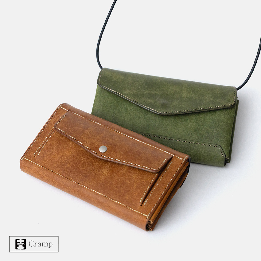 革の表情の変化やデザインを際立たせるため、革と同系色のステッチで一点一点丁寧に縫製されています。さりげないディテールですが、こうしたこだわりこそがクランプらしい魅力です。