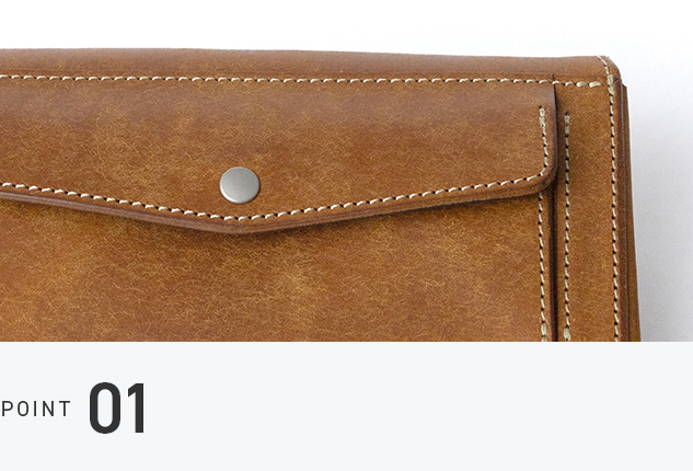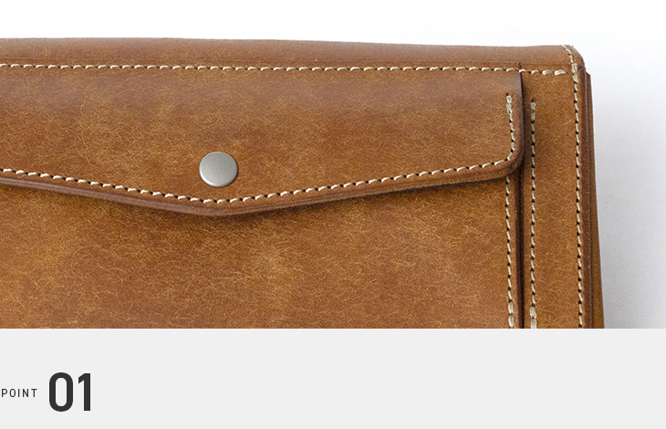 クラッチバッグとしても使える、スマートな長財布。コンパクトなのに紙幣は折らずに収納でき、クロス構造の可動式カードポケットは左右それぞれに約10枚を収納可能。さらに手前のポケットには紙幣はもちろん、スマホや小物までスッキリ収まる高機能デザインです。