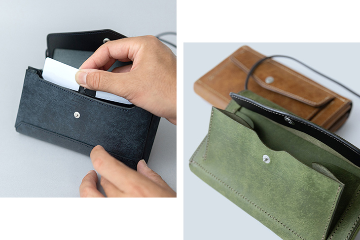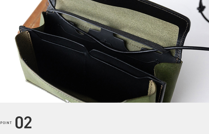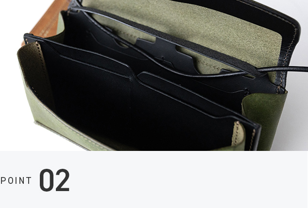フラップポケットを開けると、3つの仕切りが現れます。手前にはスマートフォンとカード、中央には紙幣とカード、後部にはレシートなどを収納可能。視認性が高く、スムーズに取り出せるデザインです。