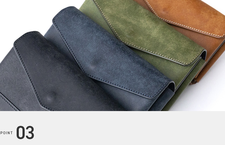 銀面(革の表面)を優しく擦り、あえて毛を逆立ててアンティーク調に仕上げたプエブロレザー。他の革よりも格段に経年変化を楽しんでいただけます。表面を擦る処理がされているため、通常よりも手の汗や脂、陽の光などの吸収が早く、傷なども目立ちにくいのが特徴です。