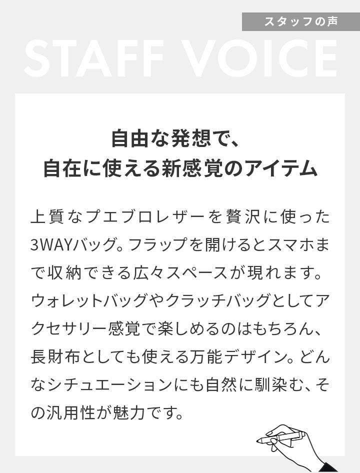 ストラップを付ければウォレットバッグ、外せばクラッチバッグ、さらに長財布としても活躍。マルチに使える汎用性が大きな魅力で、さまざまなシーンで活躍が期待できる優等生アイテムです。