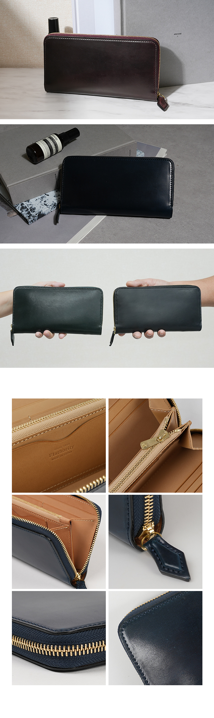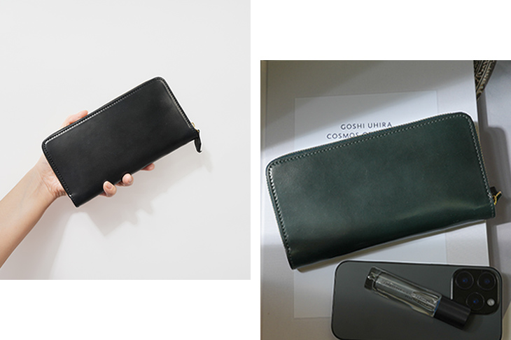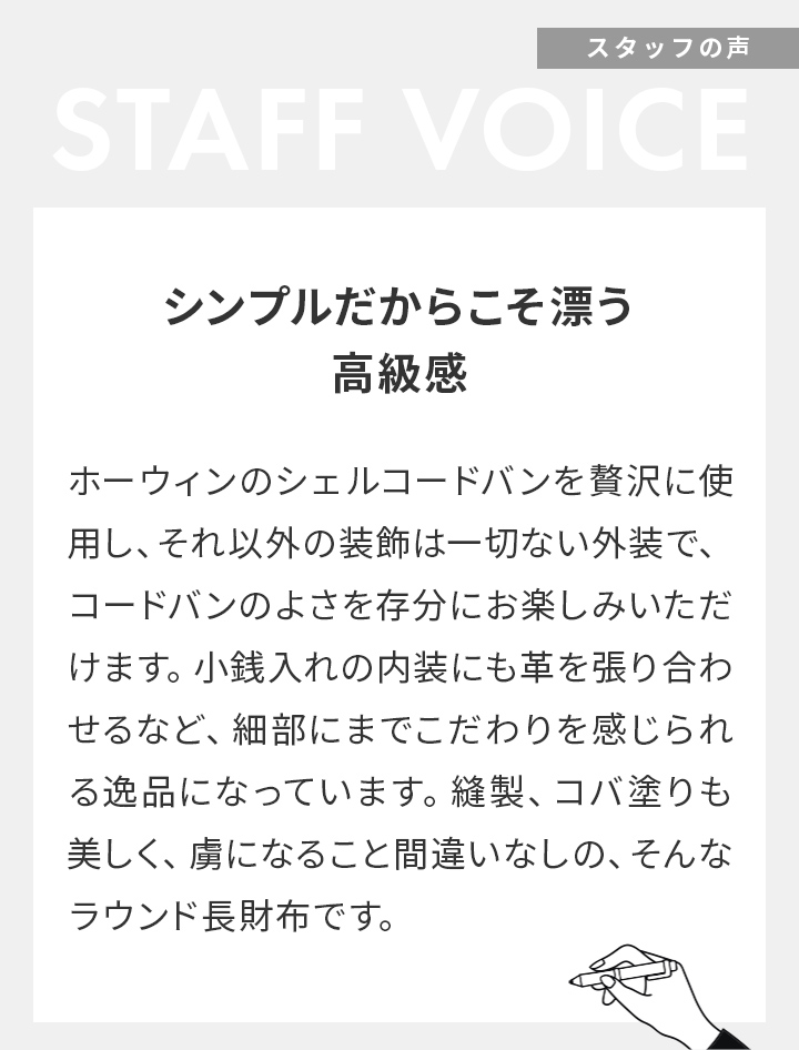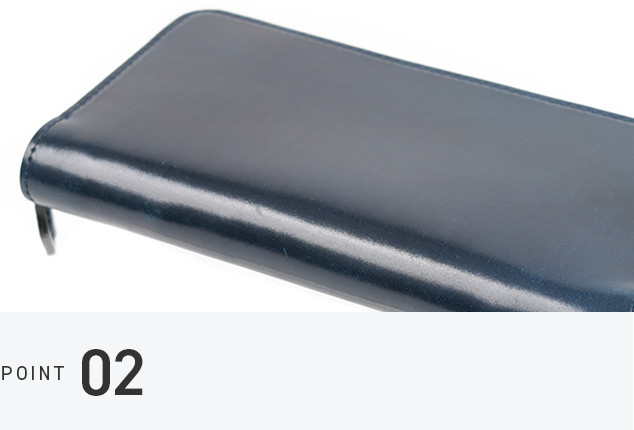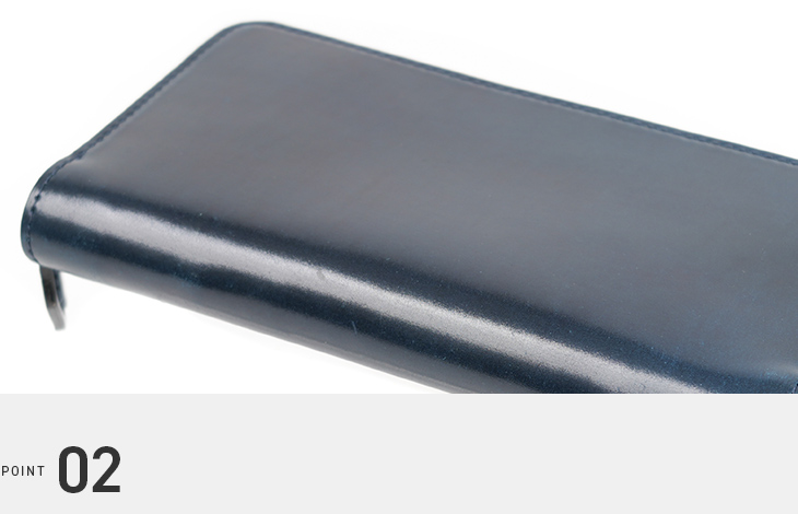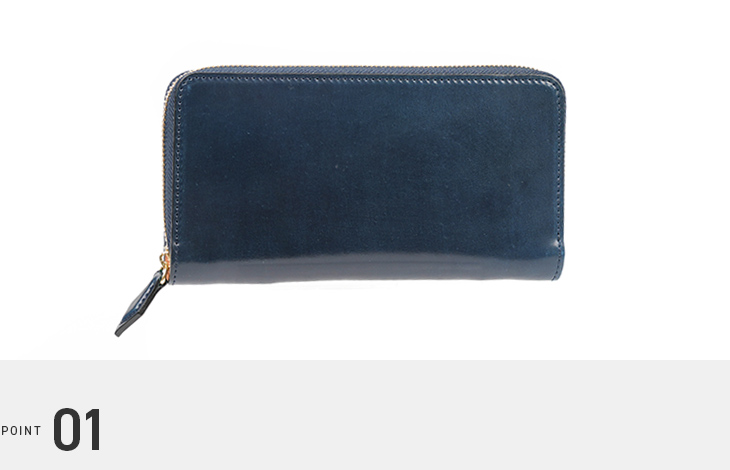 世界一のコードバンタンナーと称されるホーウィン社のシェルコードバンを使用した、ラウンドジップ長財布。縫製の際に革への負担がかかりにくいパターンを採用し、無理のない製作方法を取り入れています。これにより、「使いやすく、壊れにくい」という本質的な価値を追求しています。