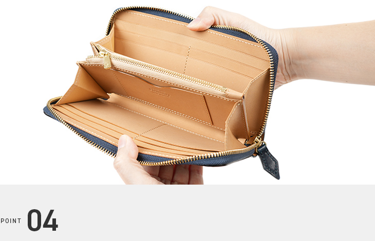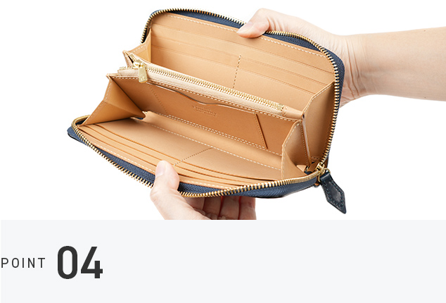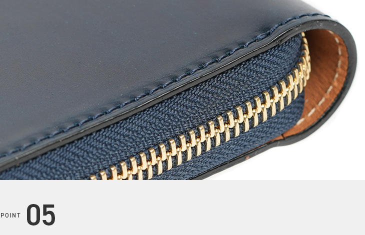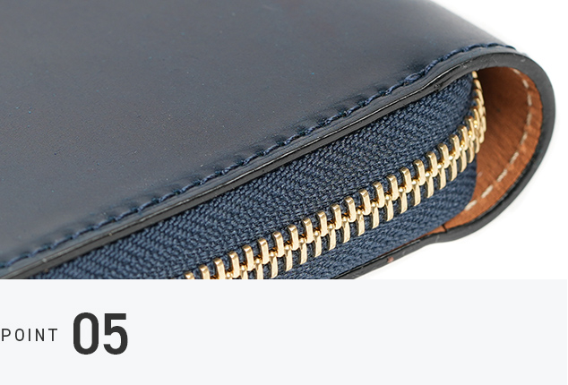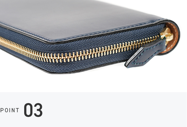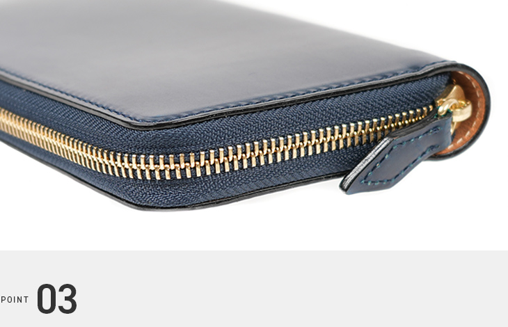 ラウンドファスナーと小銭入れのファスナー部分には、エクセラファスナーを使用しています。エレメント一つひとつに磨きをかけているため、高級感あふれる手触りが特徴です。使い込むことでさらに滑らかさが増します。