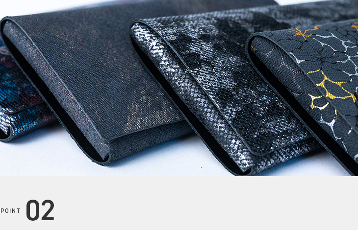 100年以上の歴史を誇る革の産地・姫路で生産された牛革です。所作ならではの特徴として、さまざまなペイント加工や、和紙のような質感を持つ牛革が挙げられます。さらに、天然革特有の「トラ」や「バラ傷」と呼ばれる箇所も、動物が持つ個性としてデザインに取り入れられています。