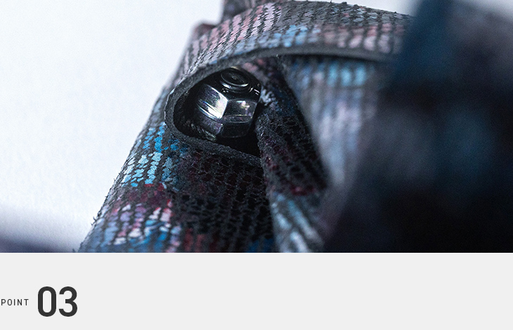 素材は革一枚とネジ一本という究極のシンプル構造。ネジにはテーマパークでも採用される強度を誇るものを使用し、外れる心配もなく、安心して長くお使いいただけます。