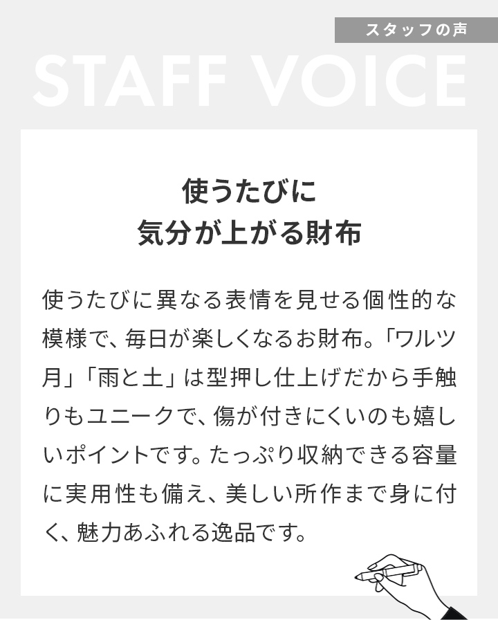 布で大切なものを包むという歴史は、日本において1000年以上前から続く美しい伝統文化です。その古来から受け継がれてきた心遣いを、誰にとっても大切なお金を扱う財布に落とし込んだのが「所作」。その所作ならではのデザイン性を、長財布としてお楽しみいただけます。
