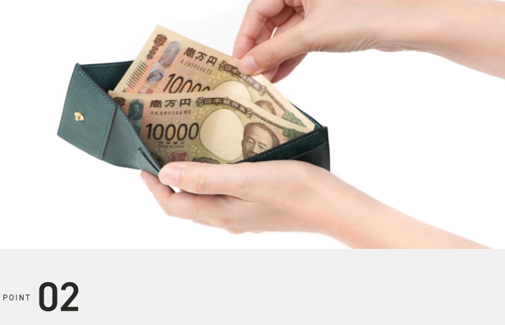 幅を広めに設定することで、お札の出し入れがストレスフリーに。しっかり広がるのでつまみやすく、またどちらかにお札を寄せることでコの字型に折り癖がつきにくくなります。