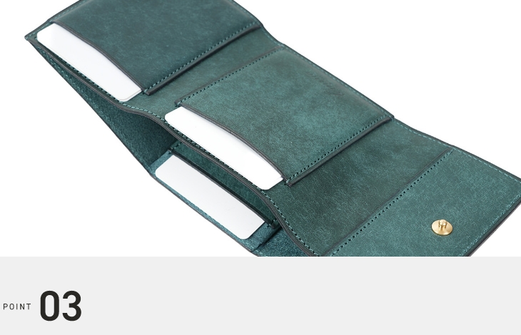 手の中にちょうど収まる三つ折りサイズ。スマートフォンと一緒にお持ちいただいても違和感がなく、小さめの鞄の中でもかさばりにくいコンパクトさに仕上げました。