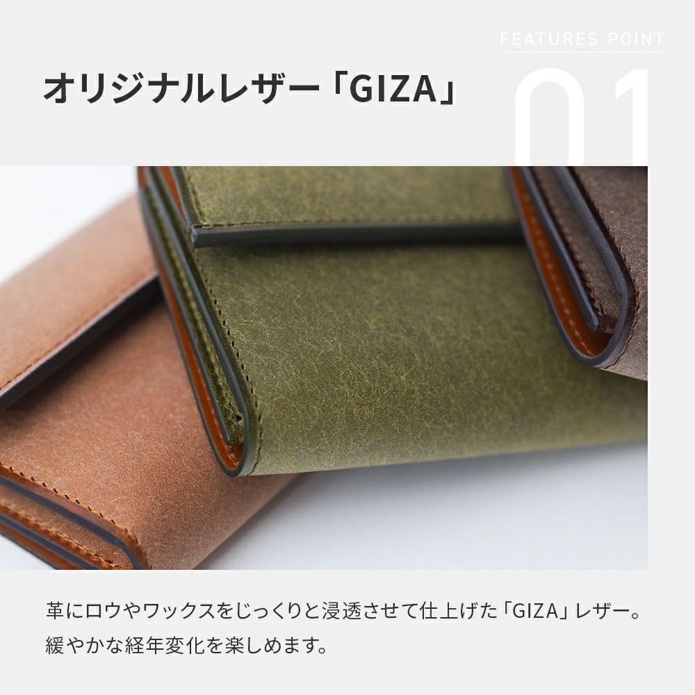 「GIZA」レザーは、スクラッチ加工を施した革にロウやワックスを浸透させた特別な素材です。優しい色合いと独特な経年変化が魅力で、これまでにないエイジングをお楽しみいただけます。