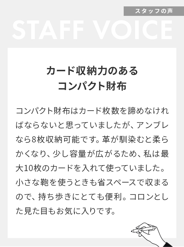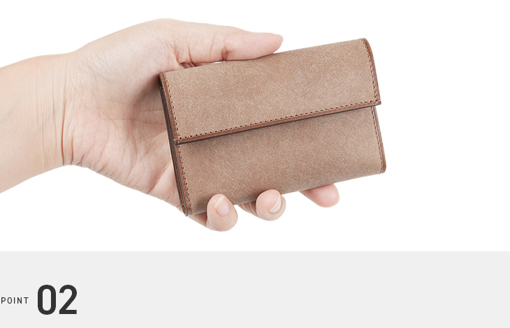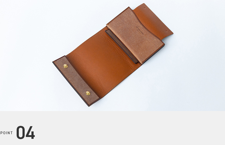 最大8枚のカードを収納できるコンパクト財布です。カードポケットは底面を開放することで、カードの束に合わせて柔軟に広がります。職人の工夫が詰まった、使いやすさを追求したデザインです。