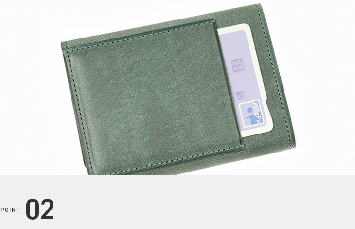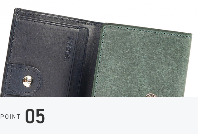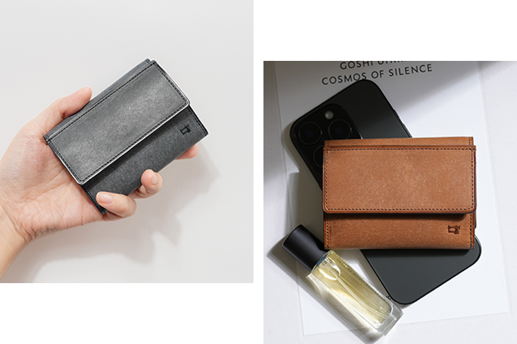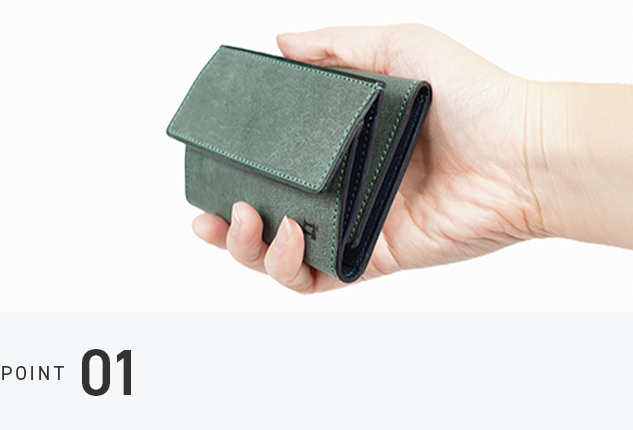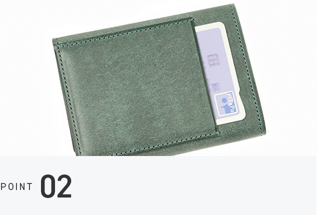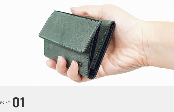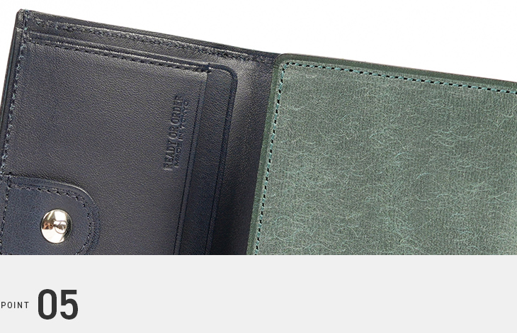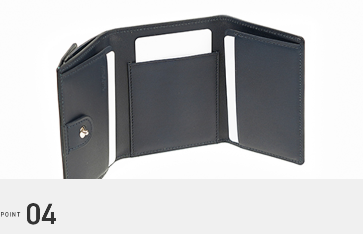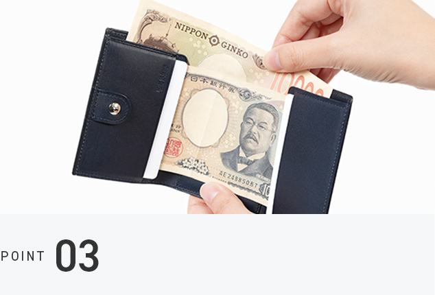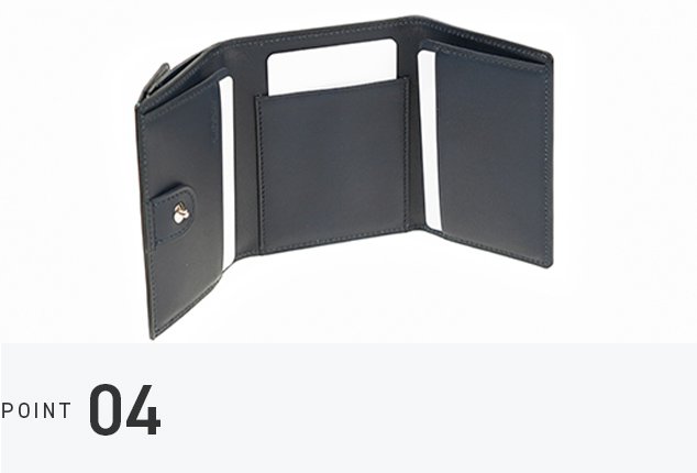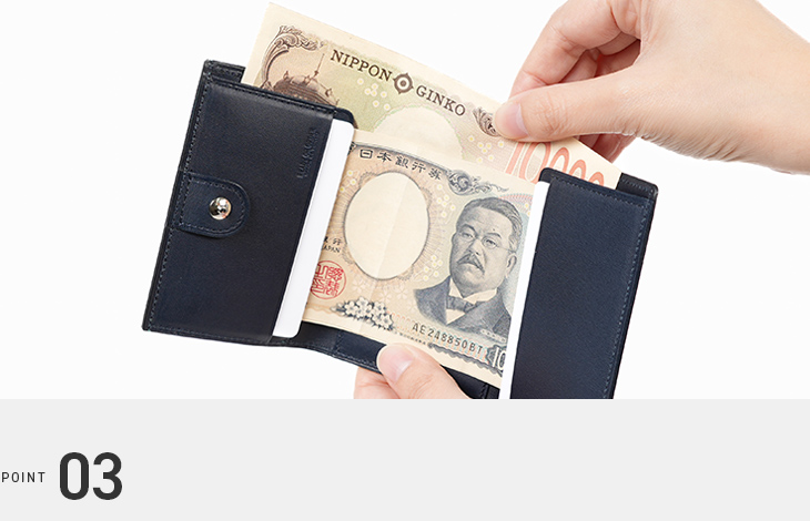 札入れは真ん中が開いた独自構造を採用。中央の革がない分薄くなるため、三つ折りでもスマートな携帯性を実現しています。取り出しやすく、スマートな会計動作が自然と身につく工夫が詰まっています。