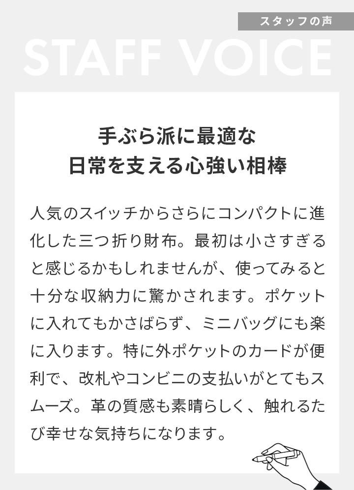 人気の三つ折り財布「スイッチ」がさらにコンパクトに進化しました。イタリア最高峰の革を贅沢に使用し、必要最低限の機能を凝縮。ミニバッグやジャケットのポケットにもすっきり収まるサイズ感ながら、使いやすさを一切妥協しない設計で、キャッシュレス時代の身軽なライフスタイルに寄り添う新しい定番です。