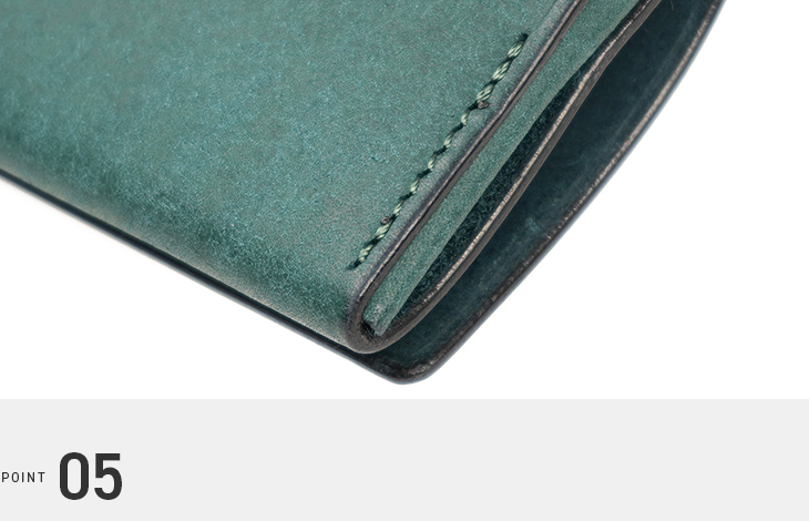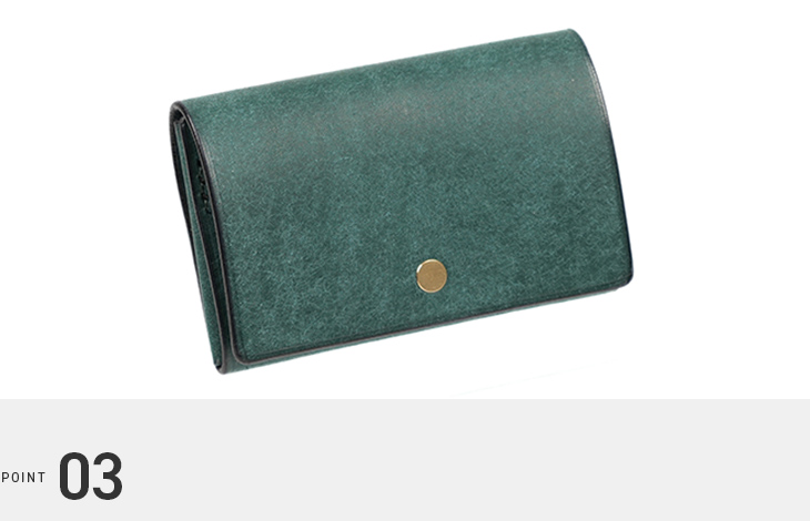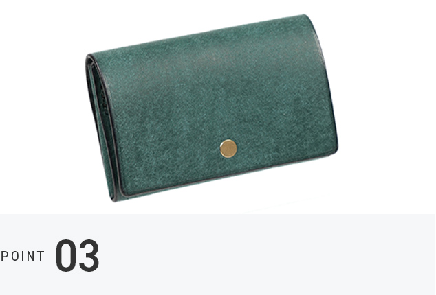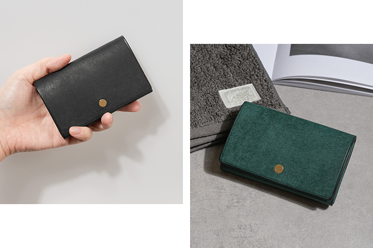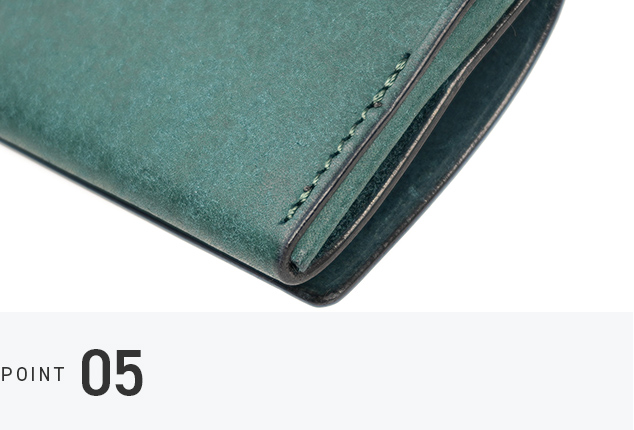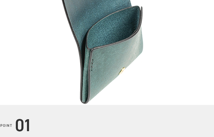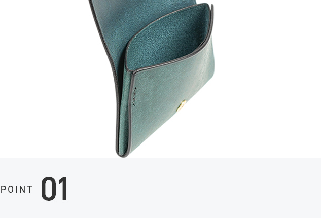 革を折り込まないシームレスな構造により、内部の厚みを抑制し、物の出し入れもスムーズです。角が潰れにくく、美しいフォルムを維持しやすい設計。デザインと実用性を兼ね備えたアイテムです。