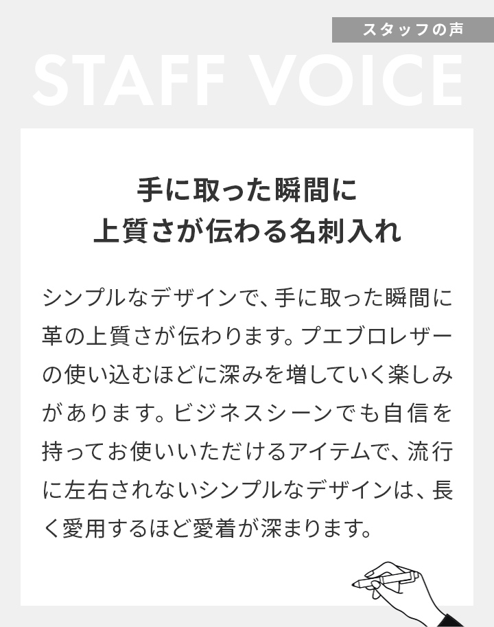 装飾を極力抑えたミニマルなデザイン。ビジネスシーンからカジュアルまで、違和感なくお使いいただけます。シンプルな佇まいは、取引先との名刺交換の際にも、品格ある印象をさりげなく演出できます。
