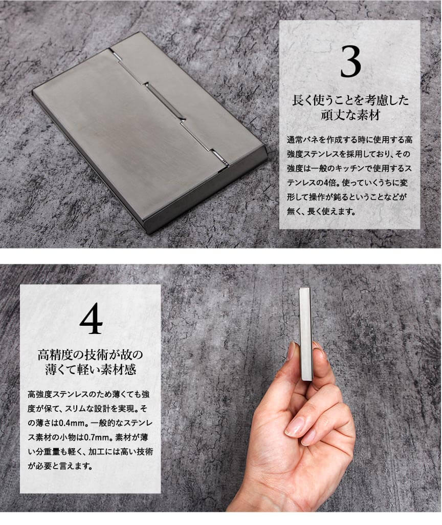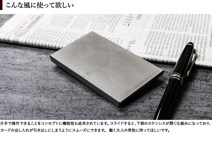 17mmのスライドさせるだけという最小限の動きでで名刺の出し入れを可能にする超薄型カードケース。