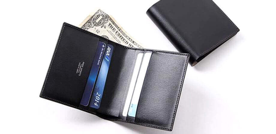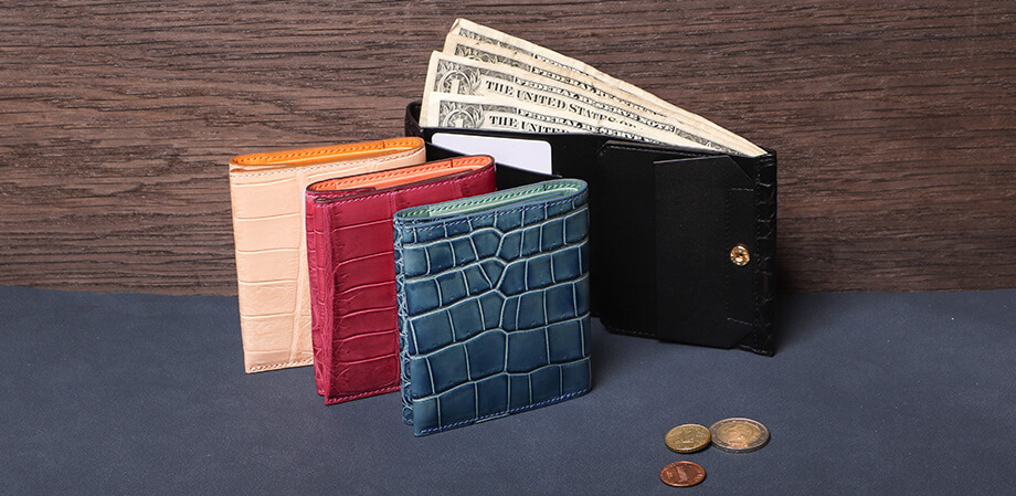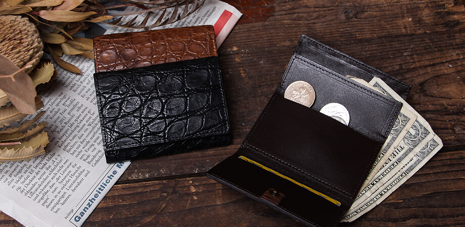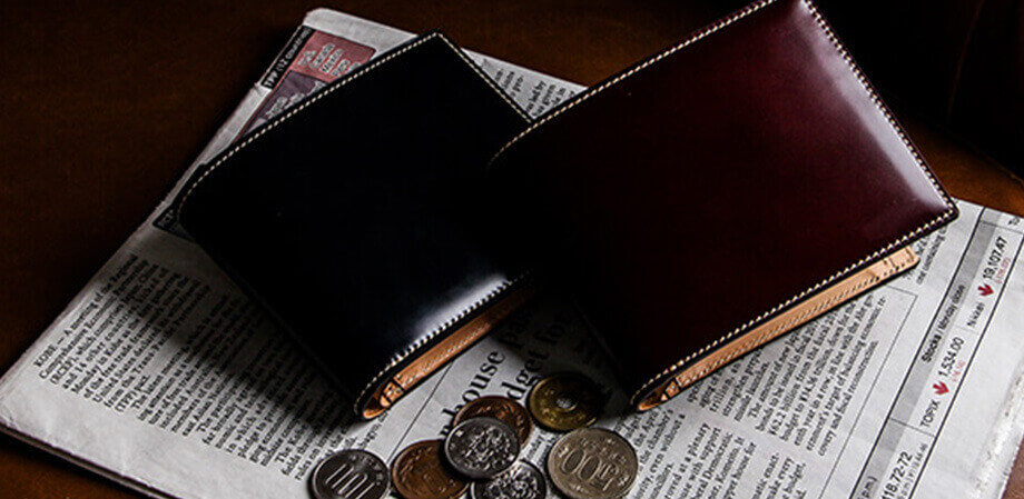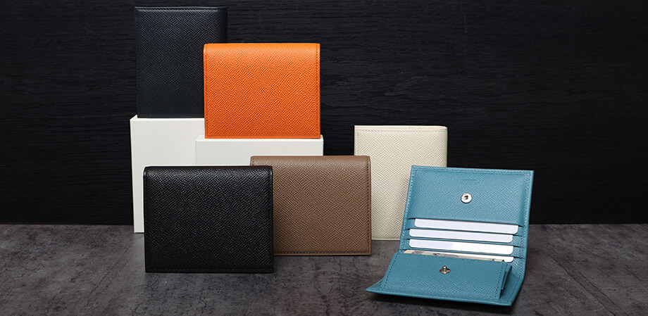 ¥35,200コバ仕上げは職人技の証。クルミボタンなどディティールまで意匠を凝らし、上質なミネルバボックスを使用した、品格ある二つ折り財布。
