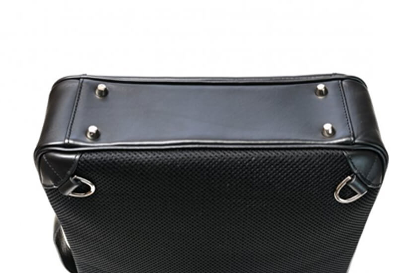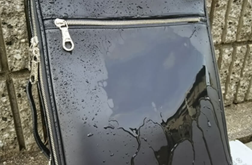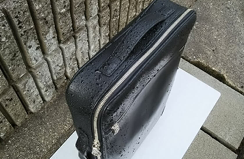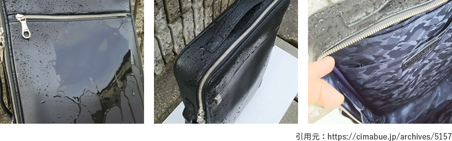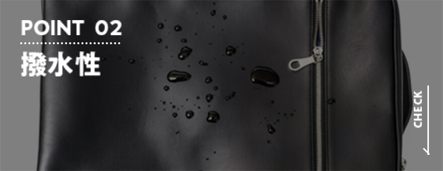 撥水性のある特殊なレザーを使用。住友3Mのスコッチガードを使ったレザー「スコッチガード加工牛革」を使うことで雨や油を弾く機能があります。