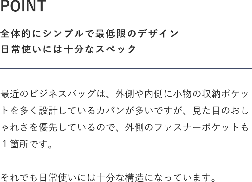 バックパックでも使える3wayや、4wayのビジネスバックは多いですが、バックパックとして使わない時の肩紐が出てのは、ちょっと……と思う人も多いはず。見た目のデザインに徹底的に拘っているので、4wayでは珍しい肩紐の完全収納が可能なバックパックです。