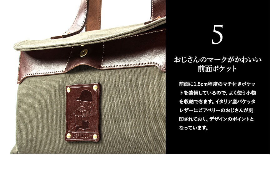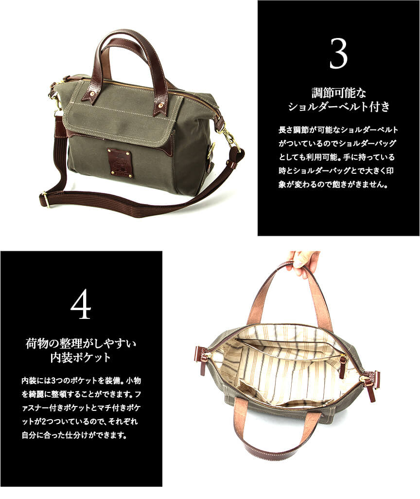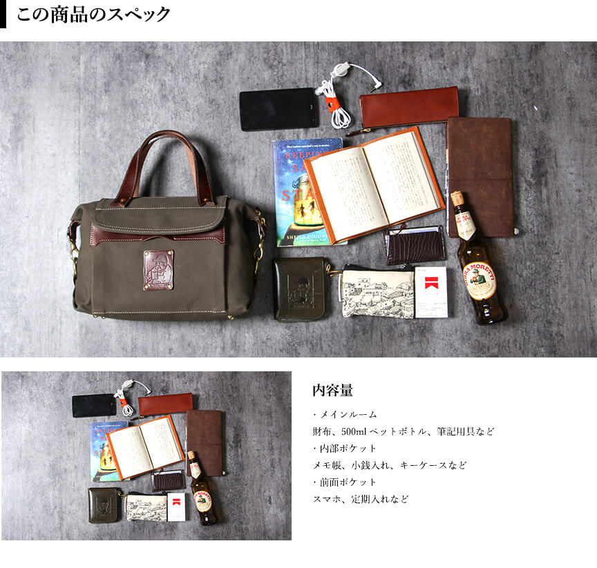 ショルダーベルトは取り付けると形が変わりショルダーバッグへ姿が変わります。フロントに横長の財布や本が入る程の大きなポケットを配置。