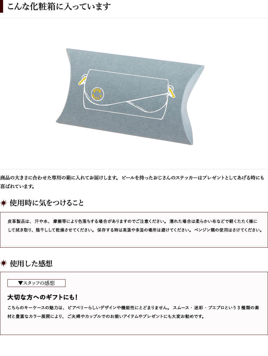 妻からのプレゼントでした。このシリーズ3つ目で大変お気に入りです。キーケースもサイズ感、触り心地、匂い、カラーすべて良きです。