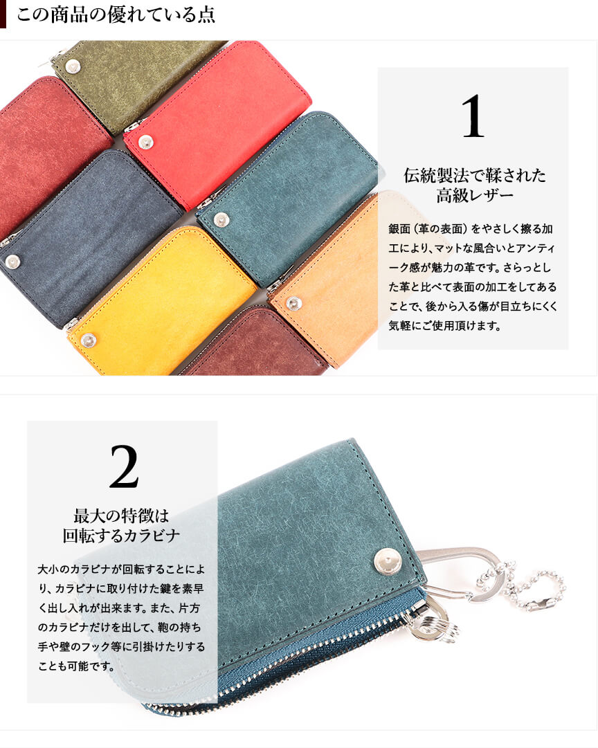 某筆記用具系youtuberを見て、 レンマのマリスコ(プエブロレザー、オルテンシア)を購入し、その色とレザーにハマった結果このキーケースを購入しました。免許証やJAFカードなどのカードを他のカードが沢山あるため、財布(マリスコ)に入れたくないと考えていました。そこで車の鍵とカードを両方収納出来るキーケースを探していました。カードを2枚、車の鍵(古い車なので普通の鍵)、家の鍵の大きな鍵を2つとENE key とロッカーなどの小さな鍵を2つ入れてもキーケース本体の形はほとんど変形しません。プエブロレザーを育てる感覚でポッケにずっと入れています!