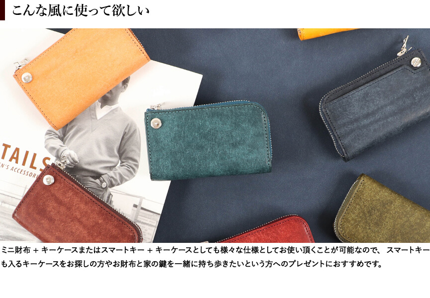 スマートキーが入り免許証、小銭など入ってこれ一つでコンビニに行けて、良いですね。革が育っていくのがとても楽しみです