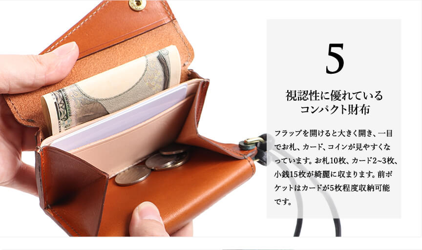 中のヌメ革がアクセントになっていて、小銭も取りやすく、紙幣と小銭をワンアクションで取り出せるので会計時にもたつく事もありません。