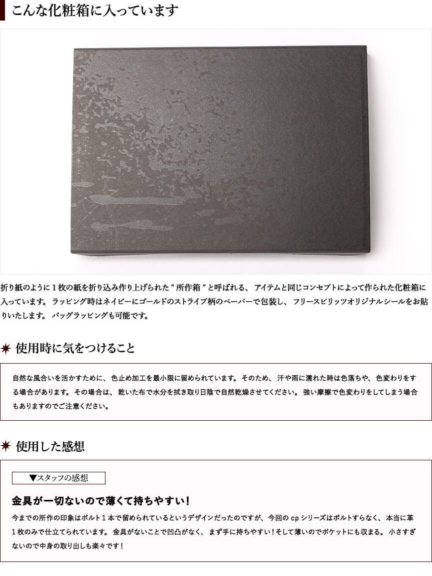 今回私は高校入学を機に環境も変わるので、お財布を新しくしようと購入させて頂きました!この商品にした決めては金具が無いところです。今まではデザインは好きでも金具の形が気に入っては居なかったりしていたので、凄く金具は使われていないというところに惹かれました。実際届いてみて、触ってみると滑らかでツルツルしてて、これを使い続けたらどんな色になるのかなぁ、とワクワクさせられました。革の匂いもクセはなく、程よくにおっていい香りです!発送されるまでに、何度かお問い合わせで確認させていただいた時も、すごく丁寧にして下さって、本当に感謝しかないです!大切に使わせて頂きます。またリピートさせて頂きたいです。
