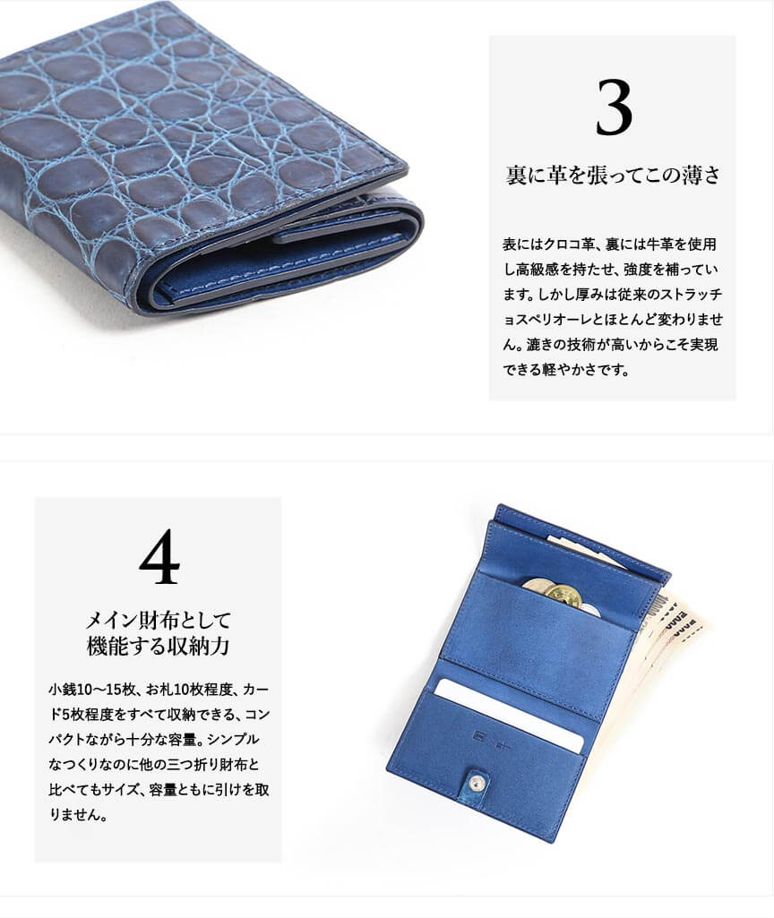 [straccio]は「端切れ・ぼろ切れ」転じて「存在感が希薄な」といった意味を持つ、肩肘を張らない財布です。 実サイズは少しゆとりをもたせて、お札10枚・100円玉15枚・厚めのカード5枚程度が入るようにしています。お札収納は折らずにそのまま入れられる[zonzo]と同じ形式をとりました。※閉じると3つ折りになります。