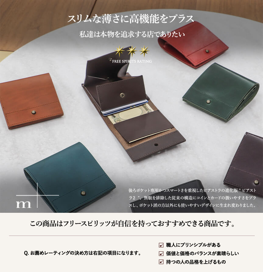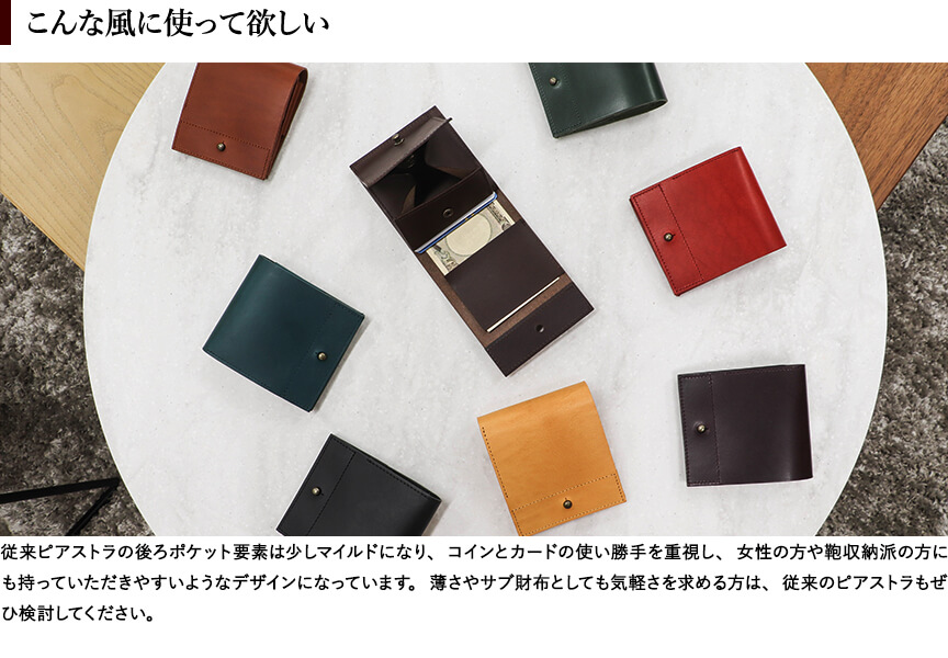ピアストラ2のブスケットレザーのグリーンを購入しました。使い始めなので革が固く少し小銭が取りずらいですが質感は最高です。良い買い物ができて良かったです。