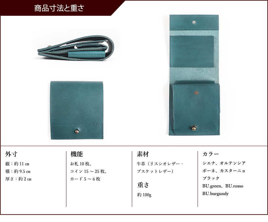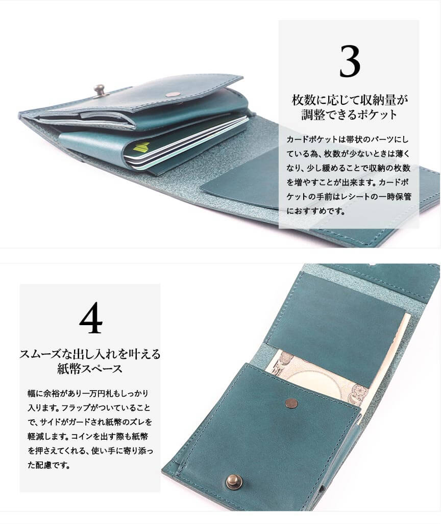 コンパクトな財布が欲しく、ネットやYouTubeからこちらの商品に辿り着きました。 決め手は大き目なコインポケットと、オルテンシアの色見です。 実際に手に取ってみると、細部まで丁寧に作られており、しっとりとした触り心地の良い革も気に入っております。 末永く愛用したいと思います。