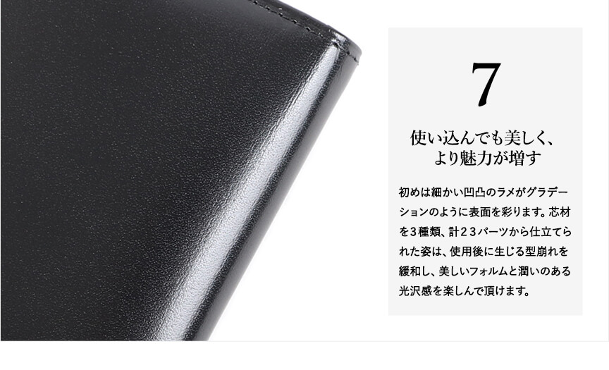 革の質感はハリがあって硬そうな感じですかね、個人的には好きです。 厚みは想像よりはあったなという印象ですが、 収納時の厚さが均等になる点は気に入っています。 置いたときの見た目がカッコいい。 新品の高級感ある感じもいいですが、 使用していくうちに革が馴染んで取り回しが良くなったら また愛着が湧きそうで楽しみだなという感じです。