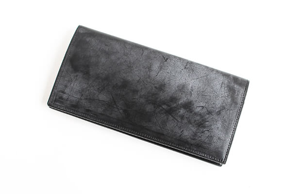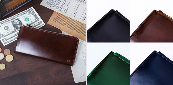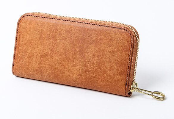 革の内部までじっくり時間をかけて染色。耐傷水光加工を施しながらも、革本来の良さを楽しめる素上げに限りなく近い状態をキープできます。透明感があり、使い込む毎に魅力が増します。