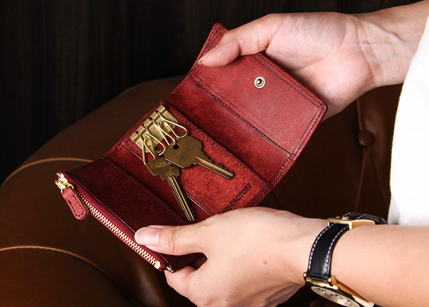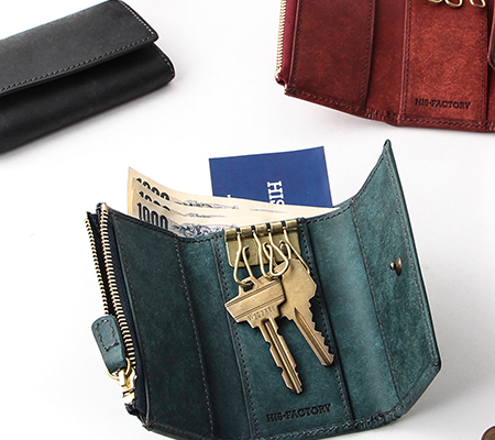 東京の革小物の職人さんが集結する一つの墨田区に拠点を構えるブランドの一つのヒズファクトリーです。フリースピリッツでも人気のブランドのエムピウとのコラボレーションアイテムのガリアルドは、エムピウの村上さんのデザインと、ヒズファクトリーの技術で誕生をしたアイテムになります。革を使った革小物や、バッグのブランドは、たくさんありますが、ヒズファクトリーの特徴はカラーバリエーションが単調なカラーに偏っていないことです。黒や茶系のカラーが多いですが、ヒズファクトリーのアイテムは、ピンクや、ブルー系などのカラーも多くのアイテムに使われています。そのため、使う人の好みに合わせて選びやすいだけでなく、年齢や世別を問わずアイテムを使って頂けるように工夫がされています。ヒズファクトリーのアイテムに使われている革の多くは、イタリアンレザーが使われています。主に、柔らかく最初から使い易いミネルバボックス、適度のハリがあり、油を最初から多く含んでいるので革の経年変化をすると最初と大きく変わるプエブロ、素材にコシがありバッグや、把手の部分に使われることが多いブッテーロの3つが取扱いの革の中心になっています。