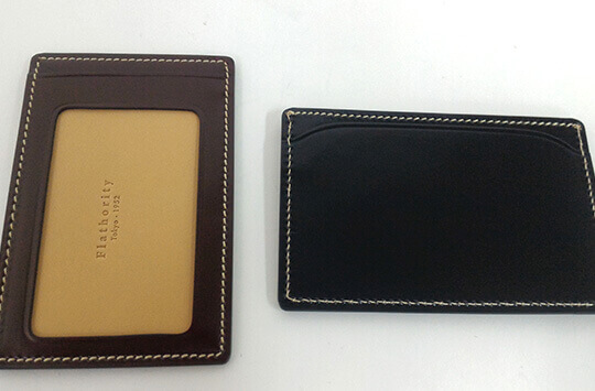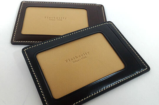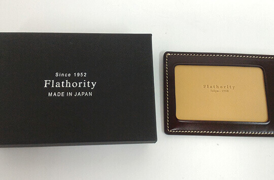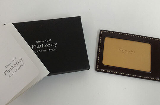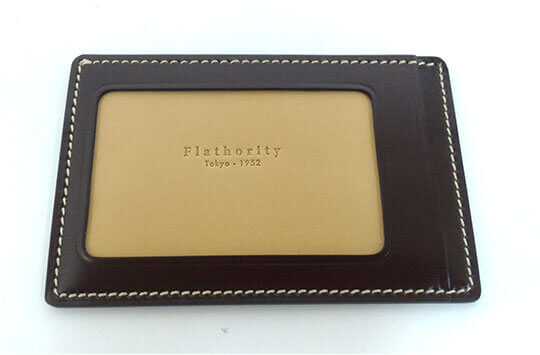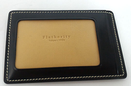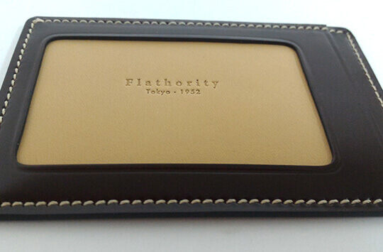 出来るだけ余計な装飾は付けずにシンプルに仕上げた逸品。窓付きのポケットにはさりげなくFlathorityのロゴマークが打刻されています。