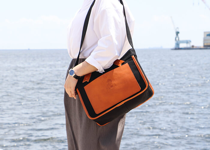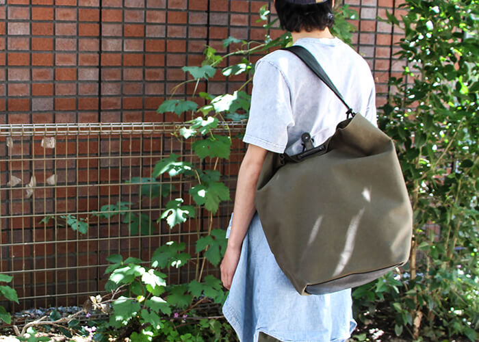 ¥22,000帆布生地と革の組み合わせに、開閉部分をクリップで留めるギミックの個性的な逸品。ショルダーストラップの長さは調整可能です。