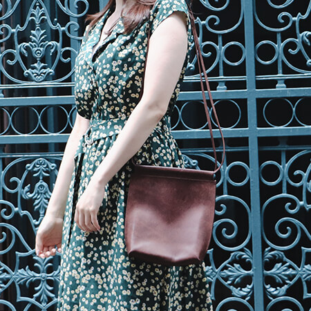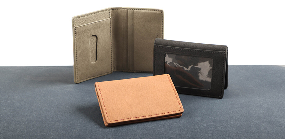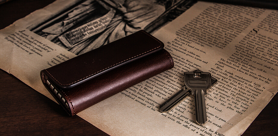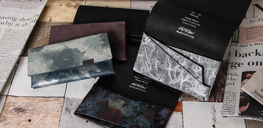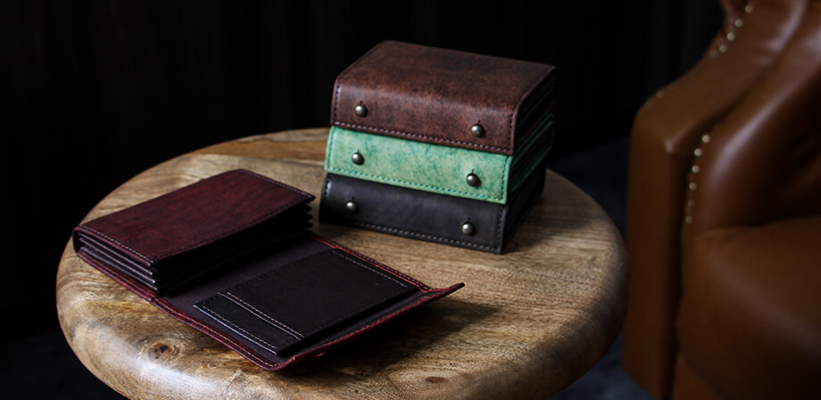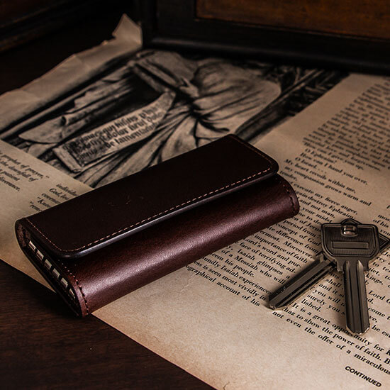 日本の伝統的な美しさを革小物に落とし込んだ所作のアイテム。1枚の革を織りこんで1本のボトルのみで留めるデッドスペースのないおしゃれな名刺入れ。