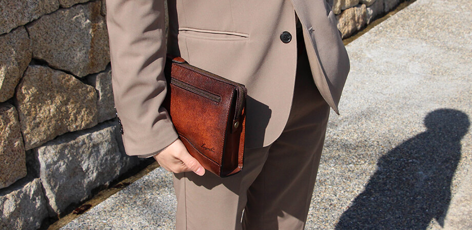 ラガード特有のシャドー仕上げの革素材が魅力のアンティーク調のクラッチバッグ。プライベートでもフォーマルなシーンでも活躍するバッグです。